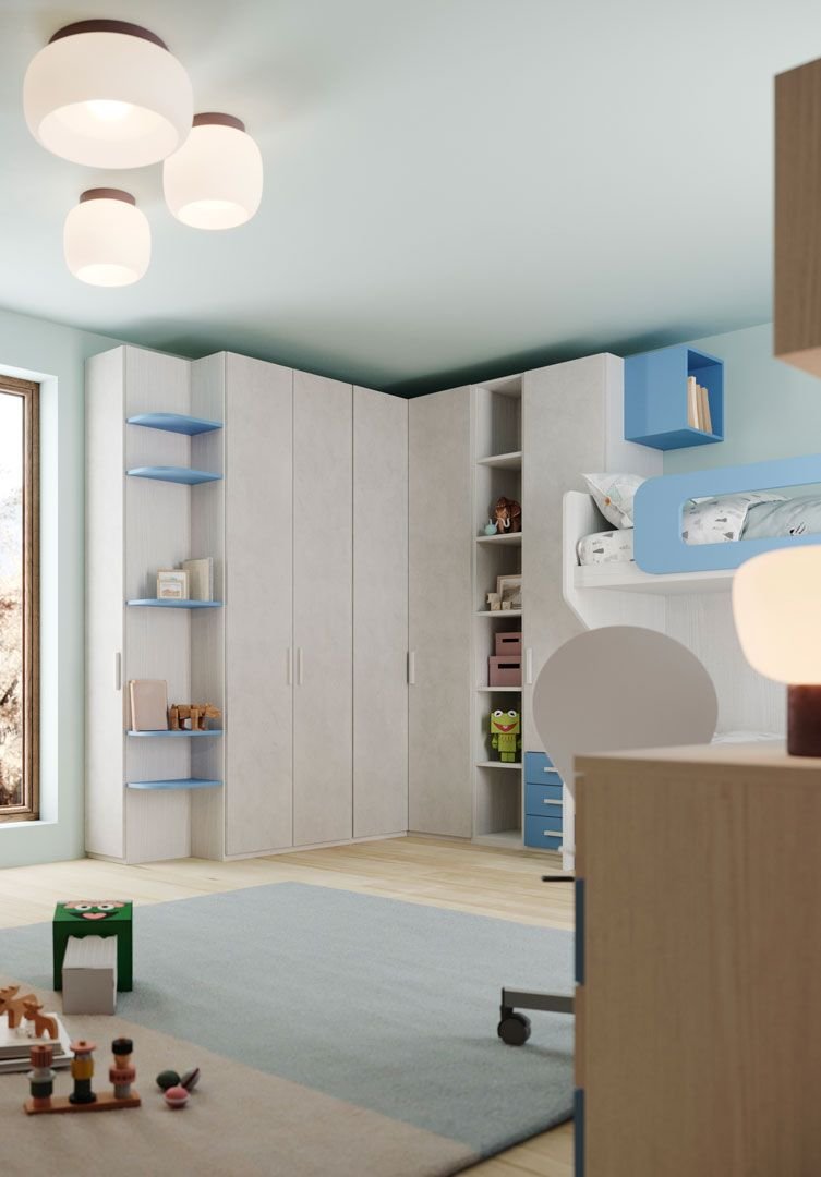 Spazio funzionale completo di armadio battente, letto a castello con gradini e scrivania.