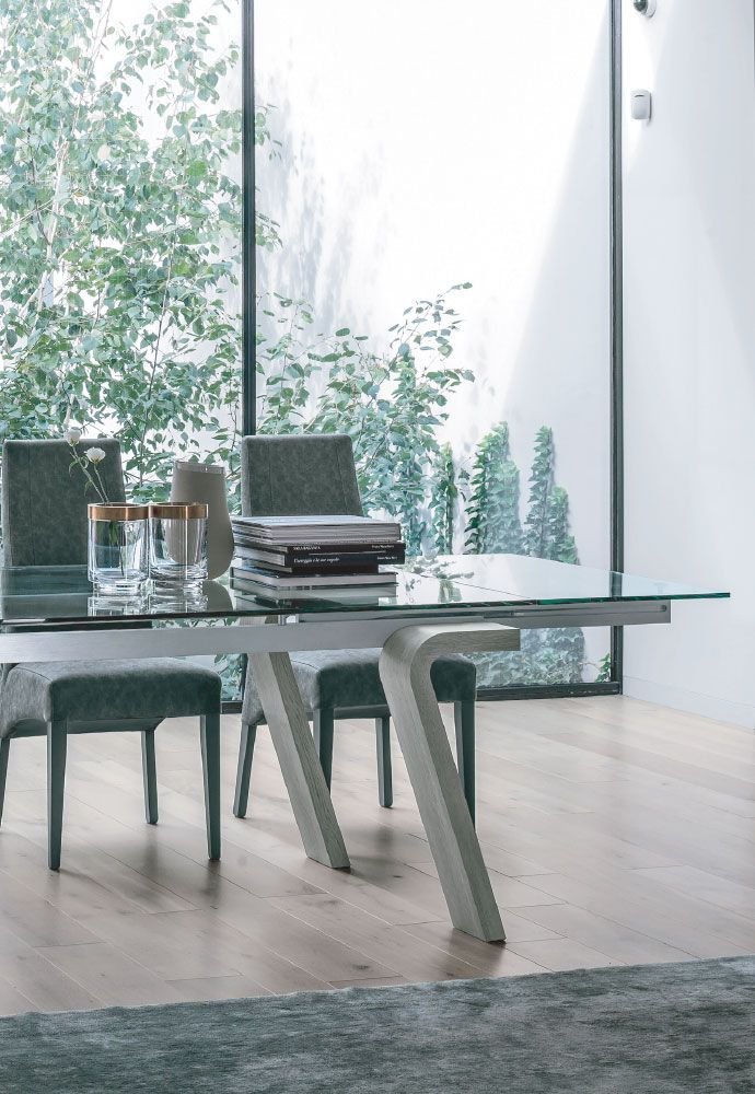 Tavolo allungabile con struttura in alluminio, gambe in laminato e top in gres porcellanato o vetro temperato trasparente.