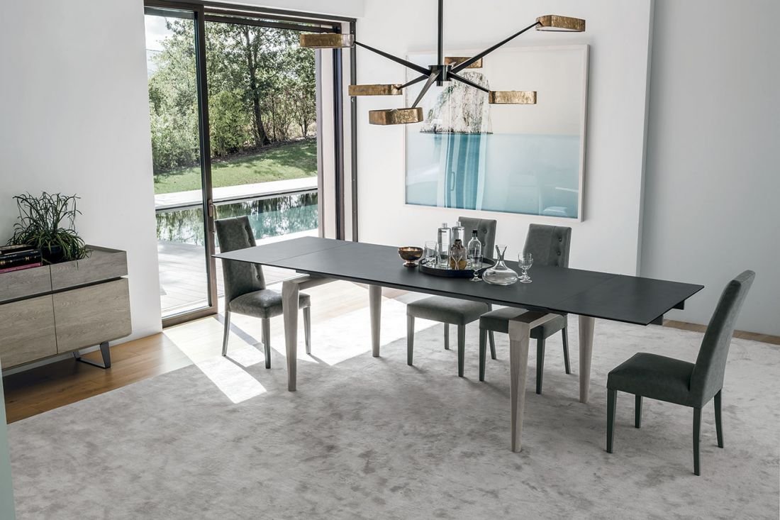 Tavolo allungabile con struttura in alluminio, gambe in legno e top in gres porcellanato o vetro