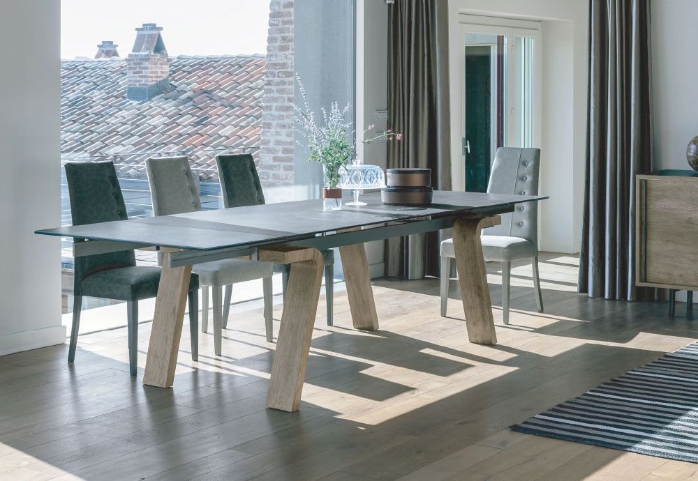 Tavolo allungabile con struttura in alluminio, gambe in laminato e top in gres porcellanato o vetro temperato trasparente.