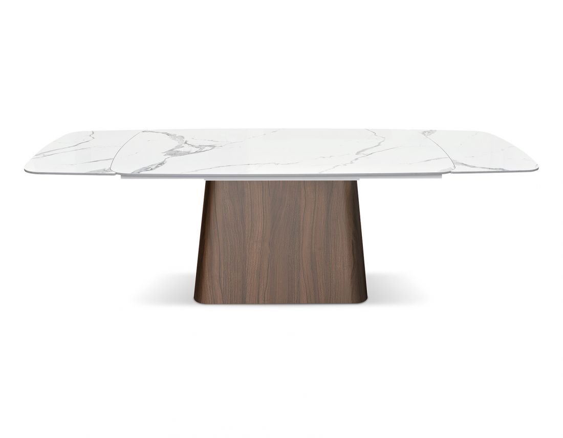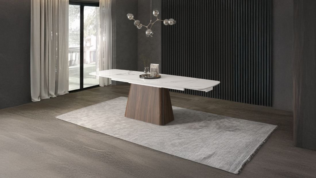 Scopri il perfetto connubio tra eleganza e funzionalità con il tavolo allungabile Nòvera, un’opera di design moderno pensata per chi cerca raffinatezza e praticità. Il suo piano in ceramica arrotondato, nella tonalità gloss statuario bianco, non solo dona luminosità all’ambiente, ma garantisce anche una superficie resistente e facile da pulire, perfetta per cene e incontri formali o quotidiani. La ceramica di alta qualità è resistente ai graffi e alle macchie, assicurando una bellezza duratura nel tempo.