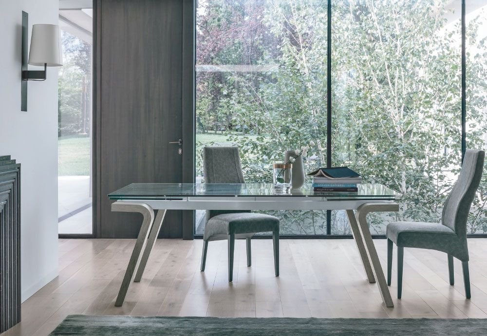 Tavolo allungabile con struttura in alluminio, gambe in laminato e top in gres porcellanato o vetro temperato trasparente.