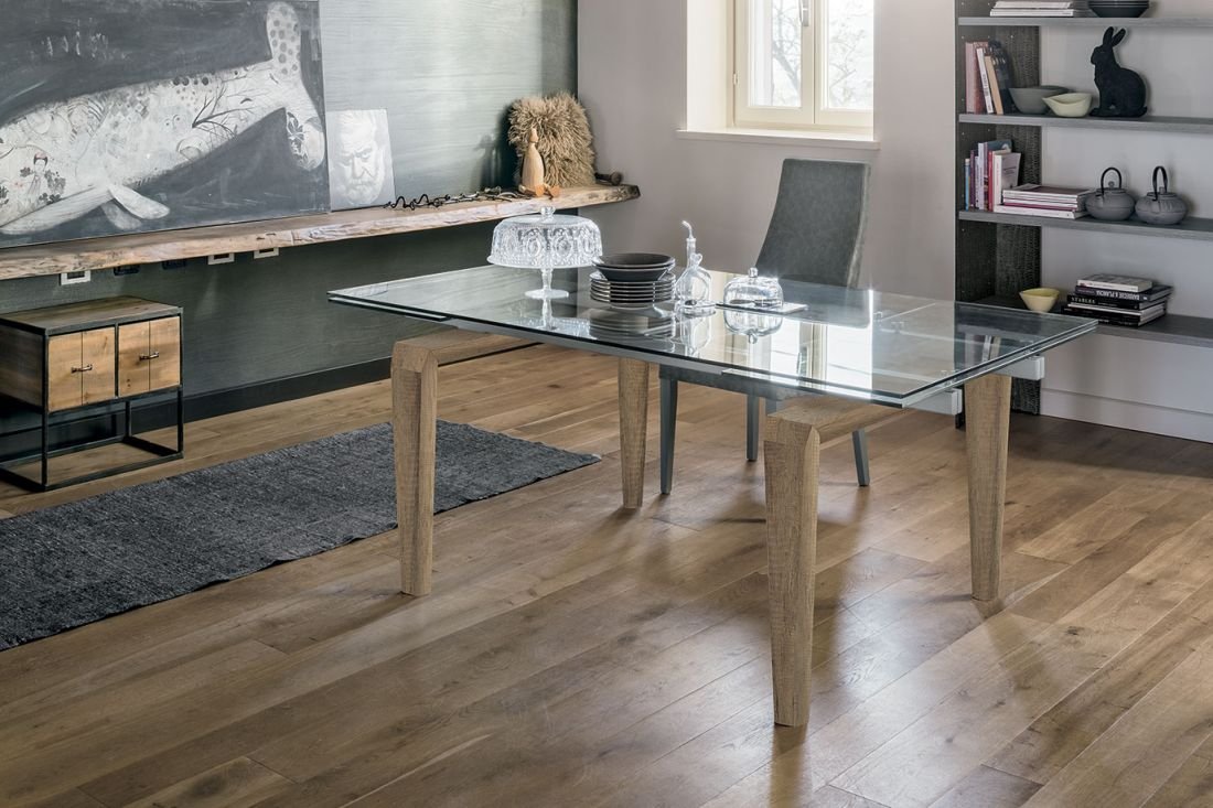Tavolo allungabile con struttura in alluminio, gambe in legno e top in gres porcellanato o vetro